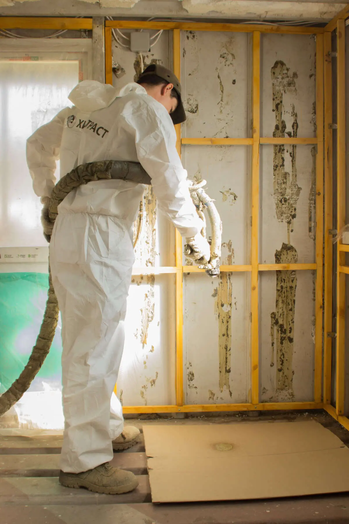 Напылять ППУ нужно на сухую поверхность, снизу вверх. Начать лучше со стен, затем заняться потолком, в последнюю очередь утеплить пол.
